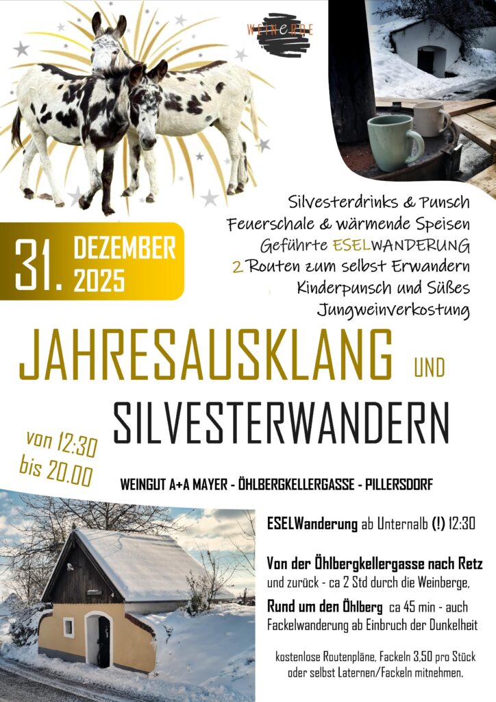 Am Silvestertag stellt sich nur die Frage: wandern oder auch nicht wandern? Jedenfalls, ab 12:30 darf man das Jahr gemütlich in der Kellergasse ausklingen lassen! Vielleicht ’nur‘ Jungwein verkosten, Punsch trinken, am Feuer stehen und das Jahr revue passieren lassen. Im Presshaus Wein einkaufen, plaudern und sich natürlich Köstliches aus Jürgen Wolfs Kochtöpfen schmecken lassen.